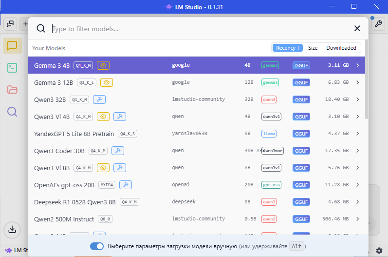 1. Выбираете и загружаете одну из локальных моделей ИИ, например, Gemma 4b, Qwen 4b или другие.