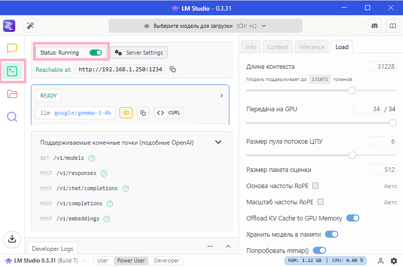 Для продвинутых пользователей и разработчиков есть очень удобная возможность активировать LM Studio как локальный сервер с API на основе протокола OpenAI. Это дает возможность использовать его как облачные, например, ChatGPT, Grok, Deepseek, Qwen и другие. Например, я сделал себе проект для личного использования, который использует локальные модели вместо облачных API, что очень удобно и бесплатно. Использование LM Studio как сервера возможно и по локальной сети с другого компьютера, например, более мощного или с установленной игровой видеокартой RTX 3060 и выше. Более старые видеокарты тоже будут работать, но с меньшей скоростью генерации.