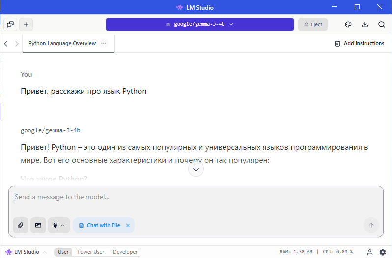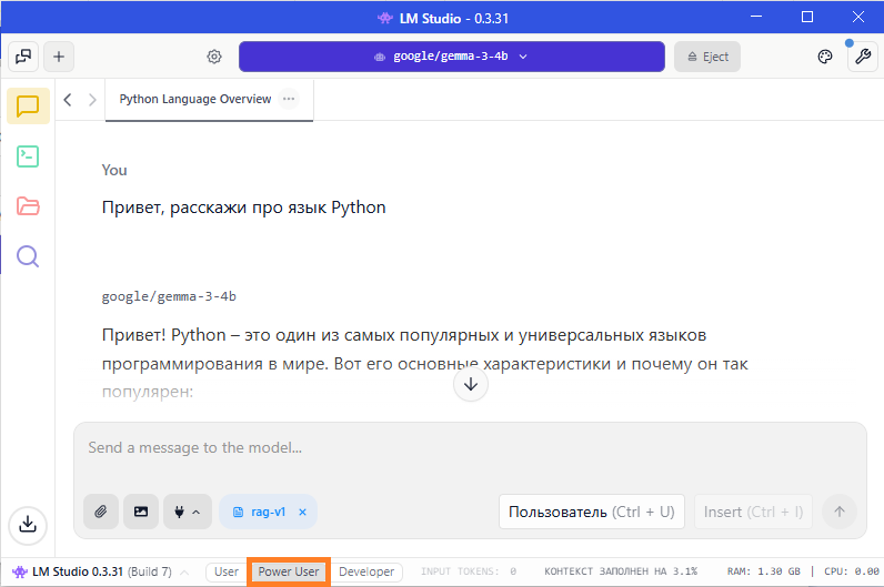 Скорость ответов напрямую зависит от мощности ПК, на котором запущена программа LM Studio. Чем более мощный у вас ПК, тем более сложные модели можно использовать для изучения и работы.